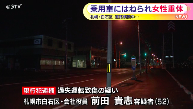 2025年11月23日、札幌市白石区の道道で高齢の女性が乗用車にはねられる事故があり、前田貴志容疑者(52)を過失運転致傷の疑いで現行犯逮捕しました。